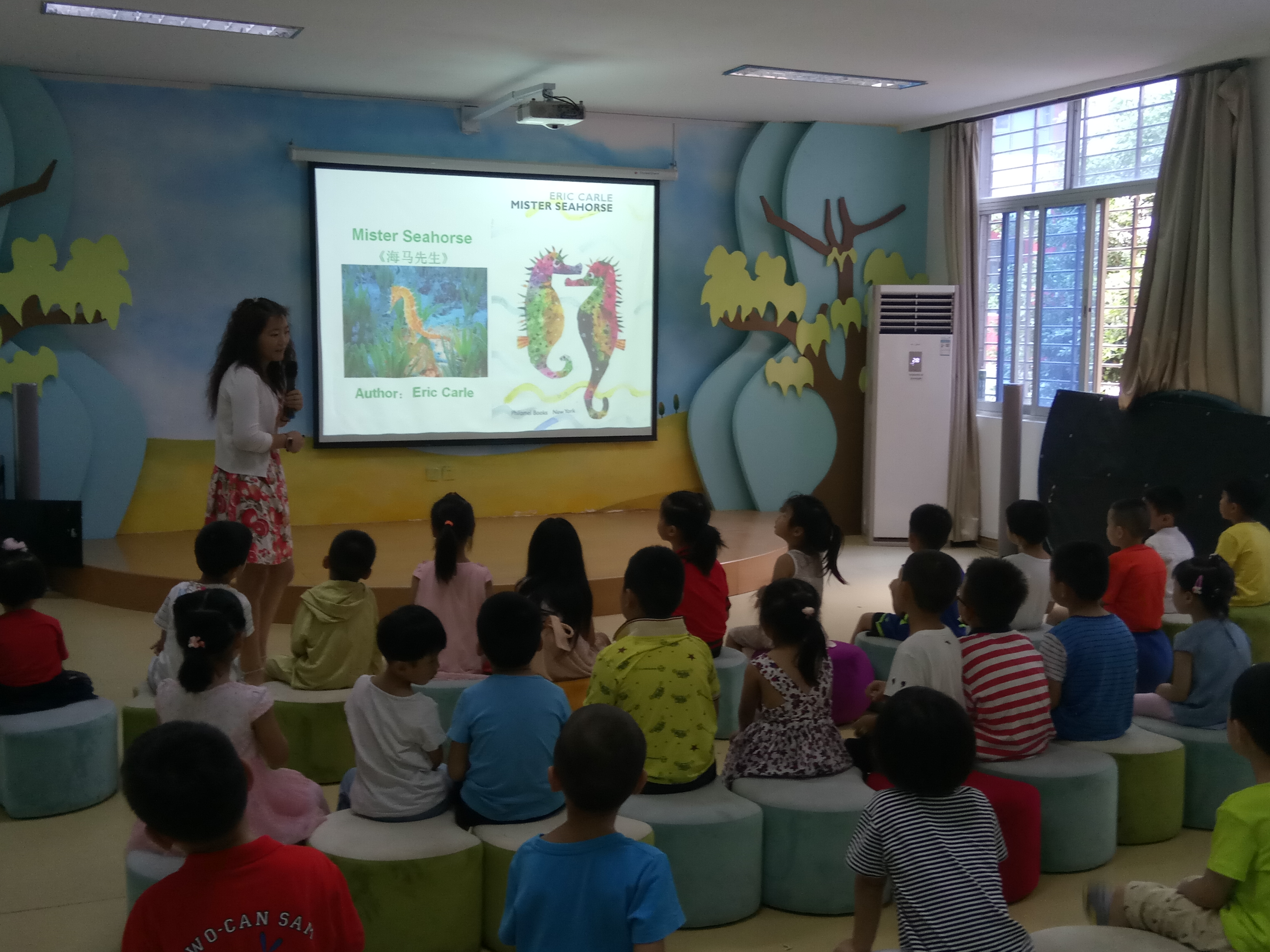 课上,李媛媛老师用图文并茂的形式展开了《图书馆的狮子》的卡通故事,她用温柔甜美的声音,绘声绘色地讲述了关于一只可爱的、毛茸茸的、喜欢到图书馆听故事的小狮子如何学会自律的故事,深受小朋友的喜爱;张思思老师则以学唱儿歌《好爸爸 坏爸爸》开场,然后以欢快、活泼的方式给小朋友带来了英文故事Mister Seahorse(《海马先生》)。她领唱领讲,用优美的声音让小朋友们爱上了这只辛苦育儿的“海马爸爸”,通过故事,小朋友不仅认识了许多的海洋小动物,还学会了各种各样的海洋动物的英语表达。
