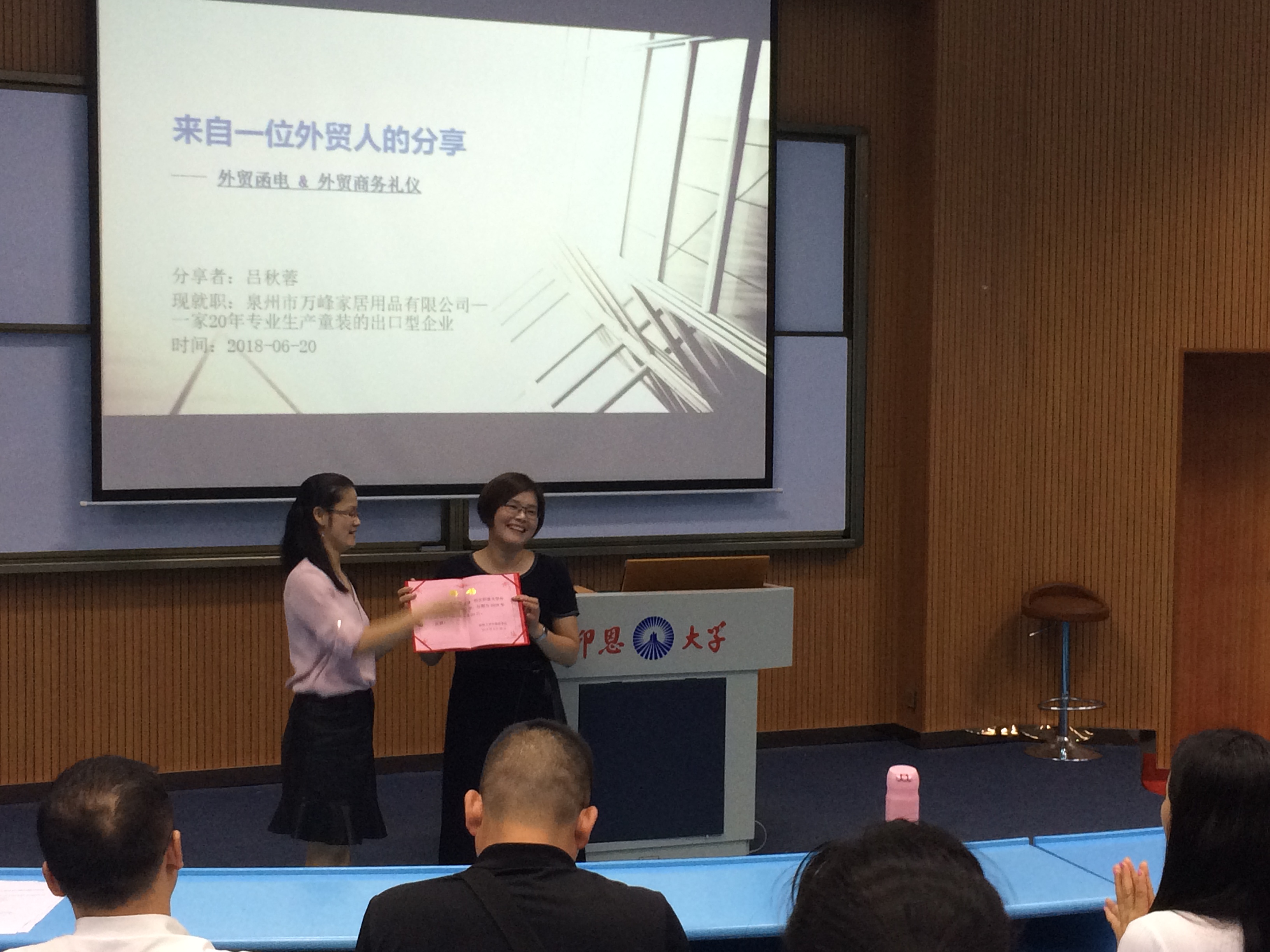 6月20日14时30分,beat365中文官方网站在新区和昌海纳讲堂举行了一场关于外贸函电与外贸商务礼仪的讲座。讲座由beat365中文官方网站院长蔡巧娜副教授主持,特邀泉州市万峰家居用品有限公司副总经理吕秋蓉女士进行授课。beat365中文官方网站全体教师、国贸系主任、英语专业学生和国贸系大二学生到场聆听。