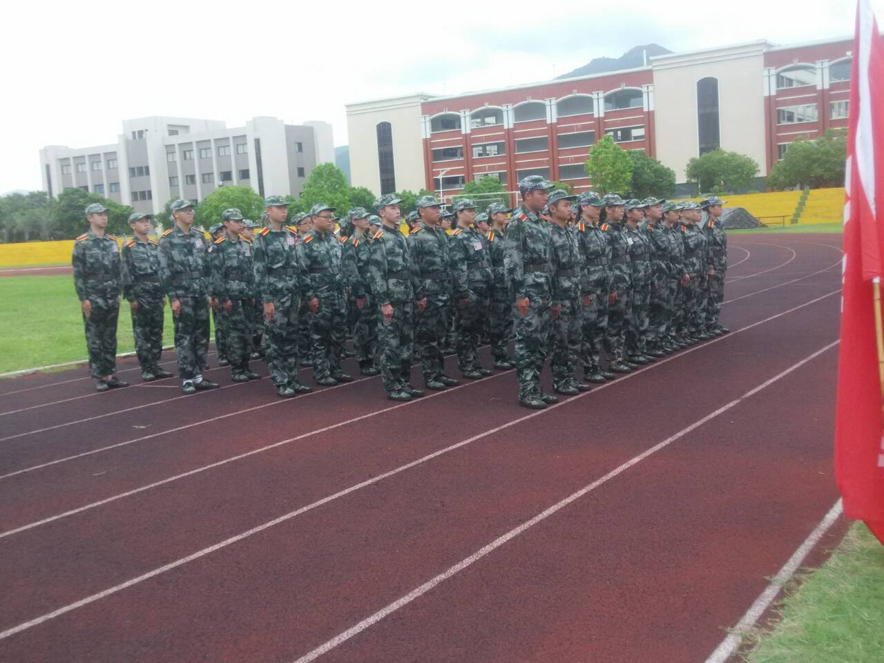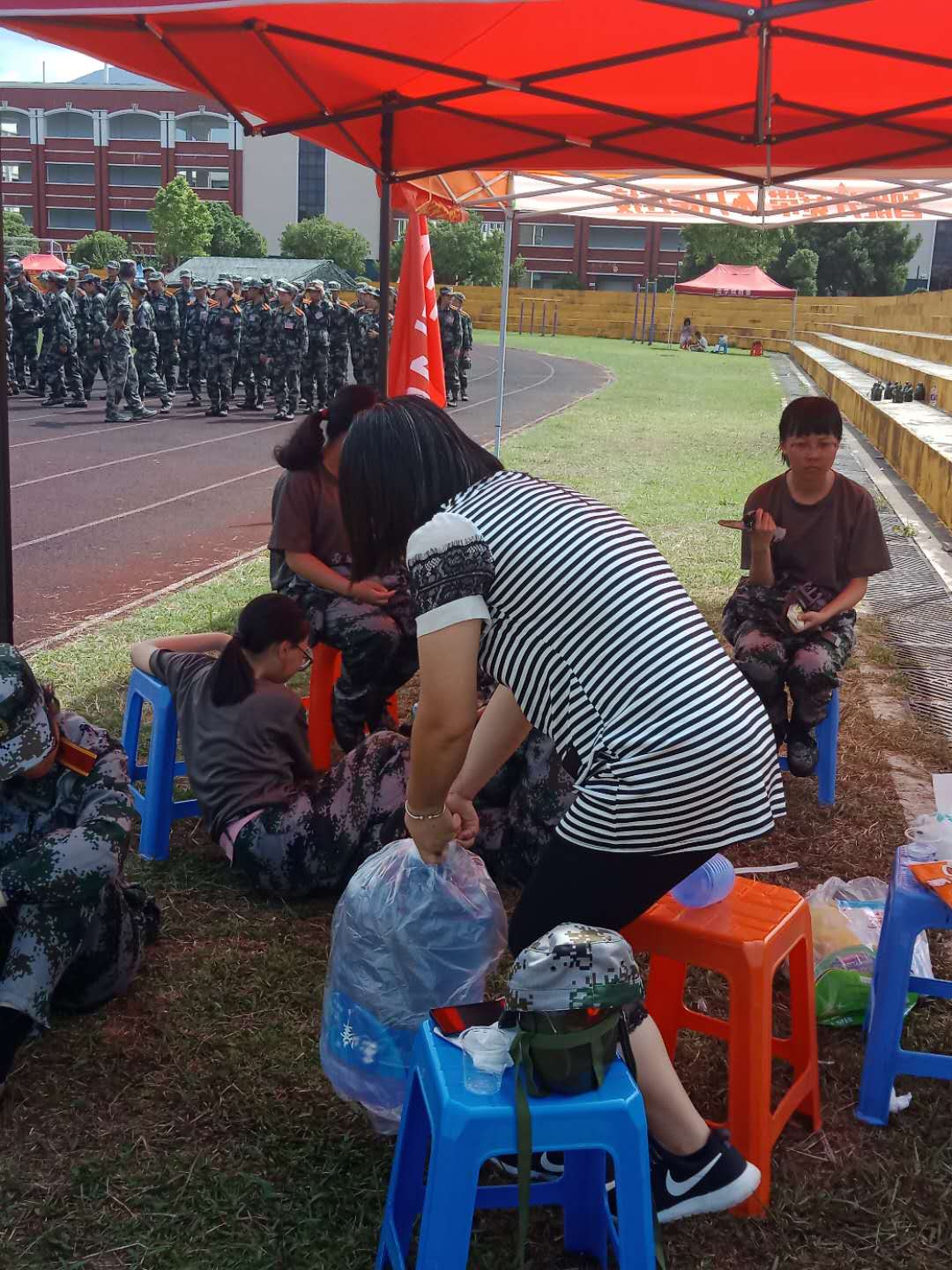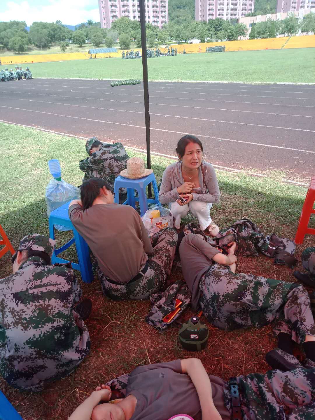 两位领导不畏炎热,更是贴心地为学生准备了红糖姜包、葡萄糖等物品。现场的学生训练情况良好,不管是站军姿还是齐步队列训练,大部分学生都能坚持下来,完成教官指令。辅导员、值班老师及学生也都坚守岗位,照顾身体不适的学生,及时帮他们降温预防中暑。对学生在军训现场的坚强表现,学院领导也给予了鼓励和肯定。