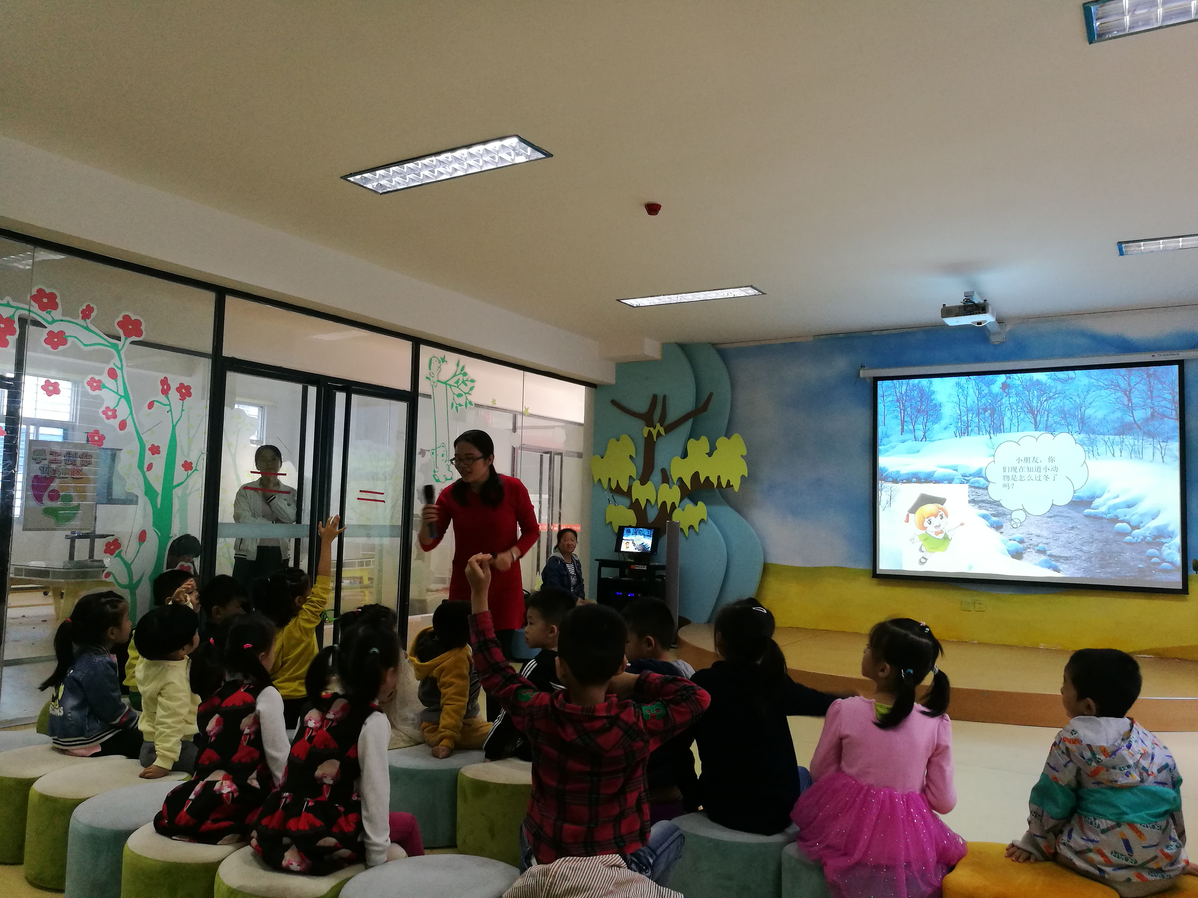 黄秋平老师讲解现场 本次绘本讲读包含中文和英文两部分,绘本内容符合了4-7岁小朋友的接受范围,吸引了近二十位小朋友前来参加。中文绘本主题为《小动物过冬》,由黄秋平老师进行讲读,她用生动的绘本故事,让小朋友们明白了动物冬眠的科学道理;英文绘本题为 《Goodnight Moon》,该部分则由肖婵婵老师进行讲读,通过如诗歌一般琅琅上口的绘本内容,让孩子们学习了一些生活用品的重点词汇,并邀请小朋友上台展示、朗读英文单词并翻译,调动其学习热情。