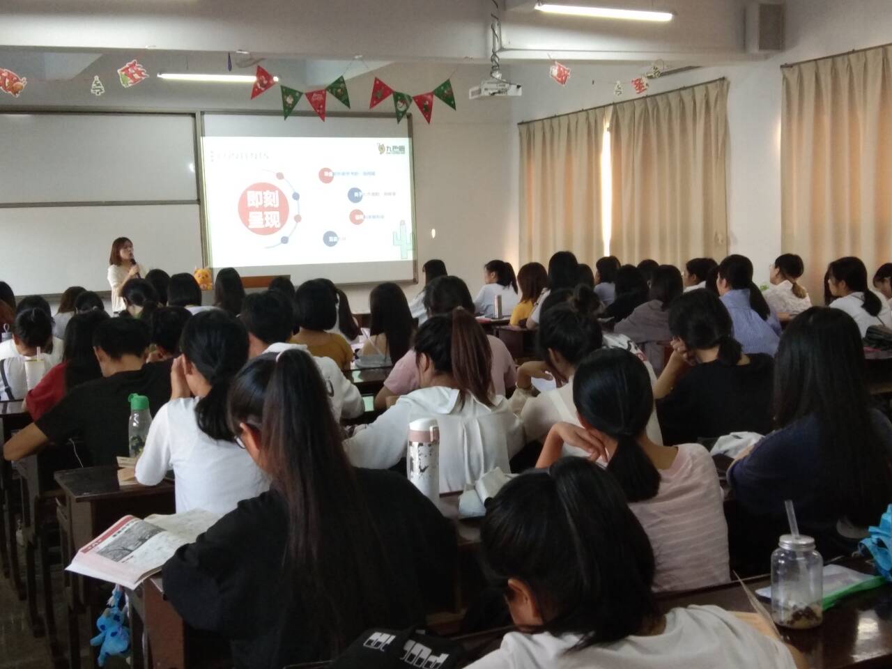 为了保证宣讲会的有效性与大家参与的积极性, 开讲前汤老师以小游戏和抽奖环节活跃现场气氛。主讲人李经理首先通过数据分析向同学们展示了教育培训行业的优势和发展前景,结合自身经历和自身经验向同学们分享了选择教育行业的优势,并对学生未来发展方向做了一个全方位的分析。最后,介绍了培训学校的经营理念,教育理念,招聘理念等。