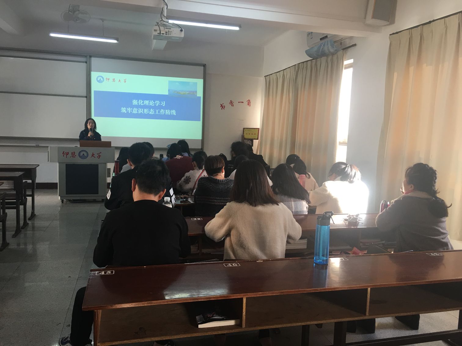 在习近平新时代中国特色社会主义思想指引下,为了扎实推进beat365中文官方网站教工党支部建设,加强教工党员的政治理论学习,全面提高教工党员综合素养,beat365中文官方网站教工党支部于2019年3月至12月,共召开了四次学习分享 会。在每次党小组学习分享会议上,各小组组长结合自己的党建工作经验,以意识形态工作、新时代新担当、一带一路等为分享主题,提出理论见解,强调教工党员在工作和生活中必须树立正确的价值理念,对国家和民族的发展要充满信心。各小组其他党员们也纷纷从党的理论知识、教学感想、科研体会等方面分享近期的学习心得,展示了教育工作者们“不忘初心,方得始终”的终身学习思想。
