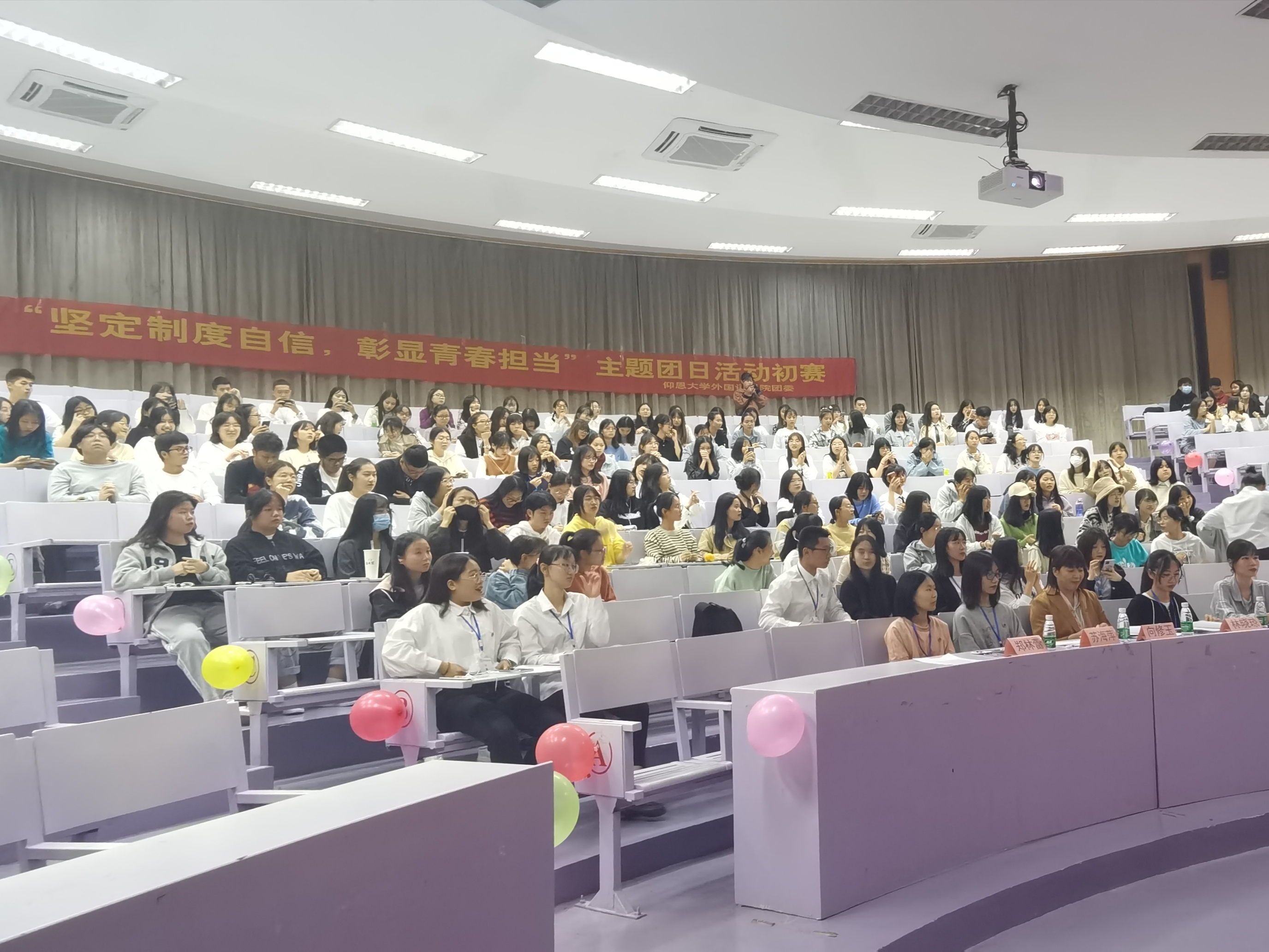 本次院初赛共有十个班级团支部参加,要求各班团支书对本班开展的“坚定制度自信,彰显青春担当”主题团日活动进行限时10分钟的汇报展示;由学生党支部书记兼团总支书记向修玉偕同团委各部门干部参与评审打分,取评审给出分数的平均分作为队伍的最终分数。各班级团支部通过PPT介绍与现场表演展示相结合的形式向大家展现了丰富多彩、各具特色的活动内容,例如:17英语2班结合专业优势,开展英文后妈茶话会的创意展示,展现青年才华魅力,获得现场一致好评;18英语1班活动期间组织全班同学观看抗疫特别节目《人世间》雷神山纪事,让同学们了解我国为抗击疫情所做出的巨大努力;19英语2班活动期间在班委的组织下走上街头有序开展有关我国政治、经济、制度等方面的问卷调查并为不懂的路人解答,帮助他们更好的了解自己的国家;19商英1班录制《中国加油》短视频,团员用各自家乡方言诉说抗击疫情温暖语句,为中国加油;20商英1班深情朗诵节目《山河无恙在我胸》,致敬我们英雄的祖国、英雄的时代、英雄的人民。经过评审打分,最终院初赛结果如下: