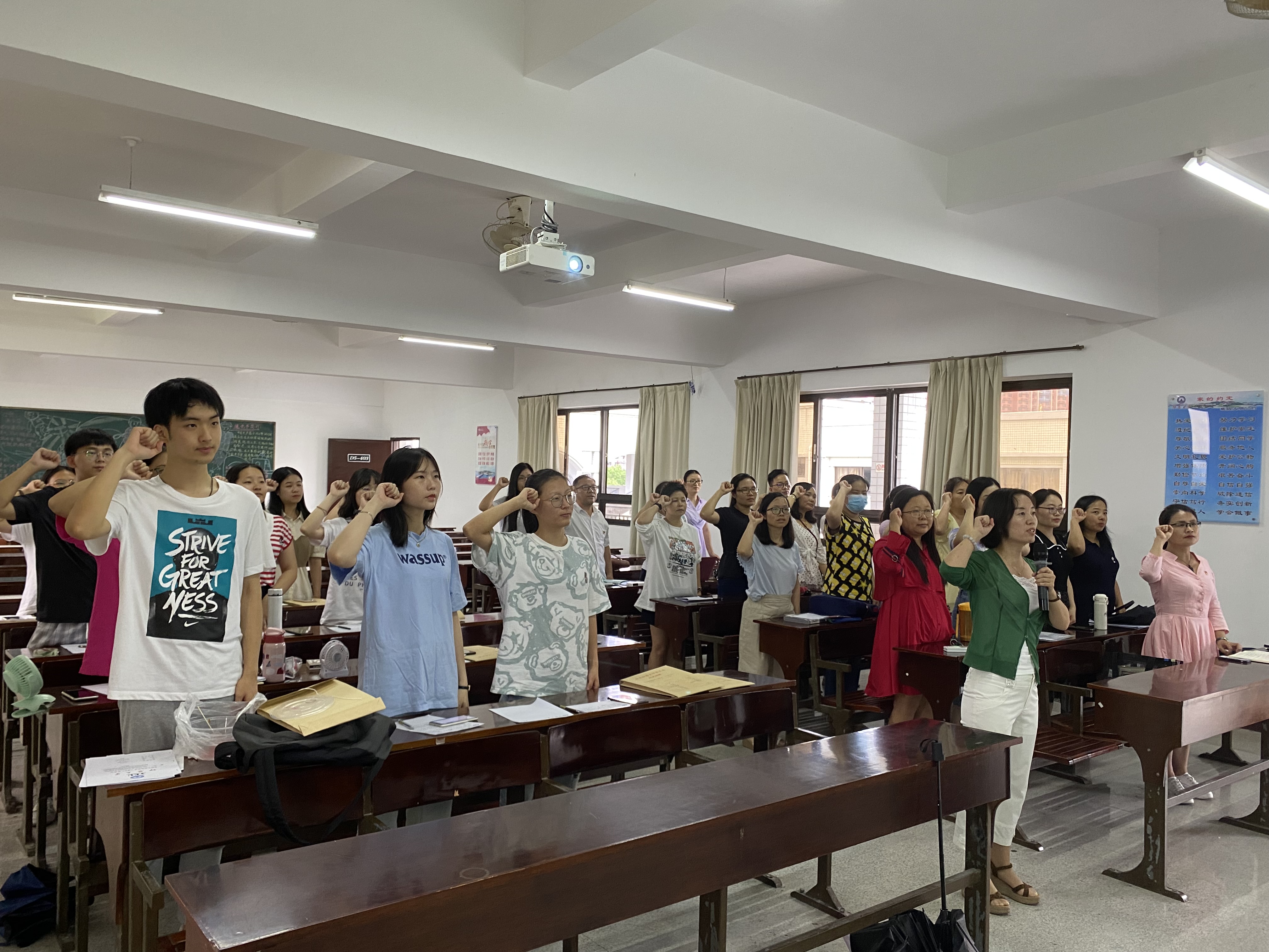 活动现场 会议伊始,由刘冬利老师带领所有参会人员重温入党誓词,全体成员面向党旗,高举右拳,庄严宣誓。紧接着是教师党员为学生党员佩戴党徽,给予毕业生党员诚挚的毕业祝福。