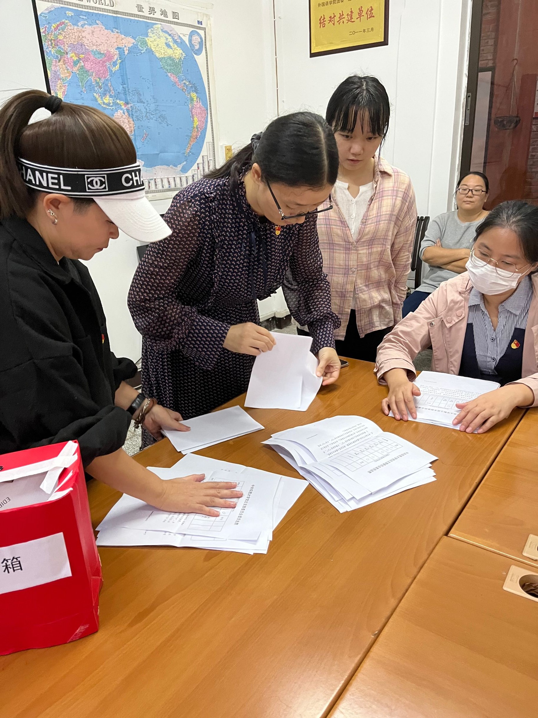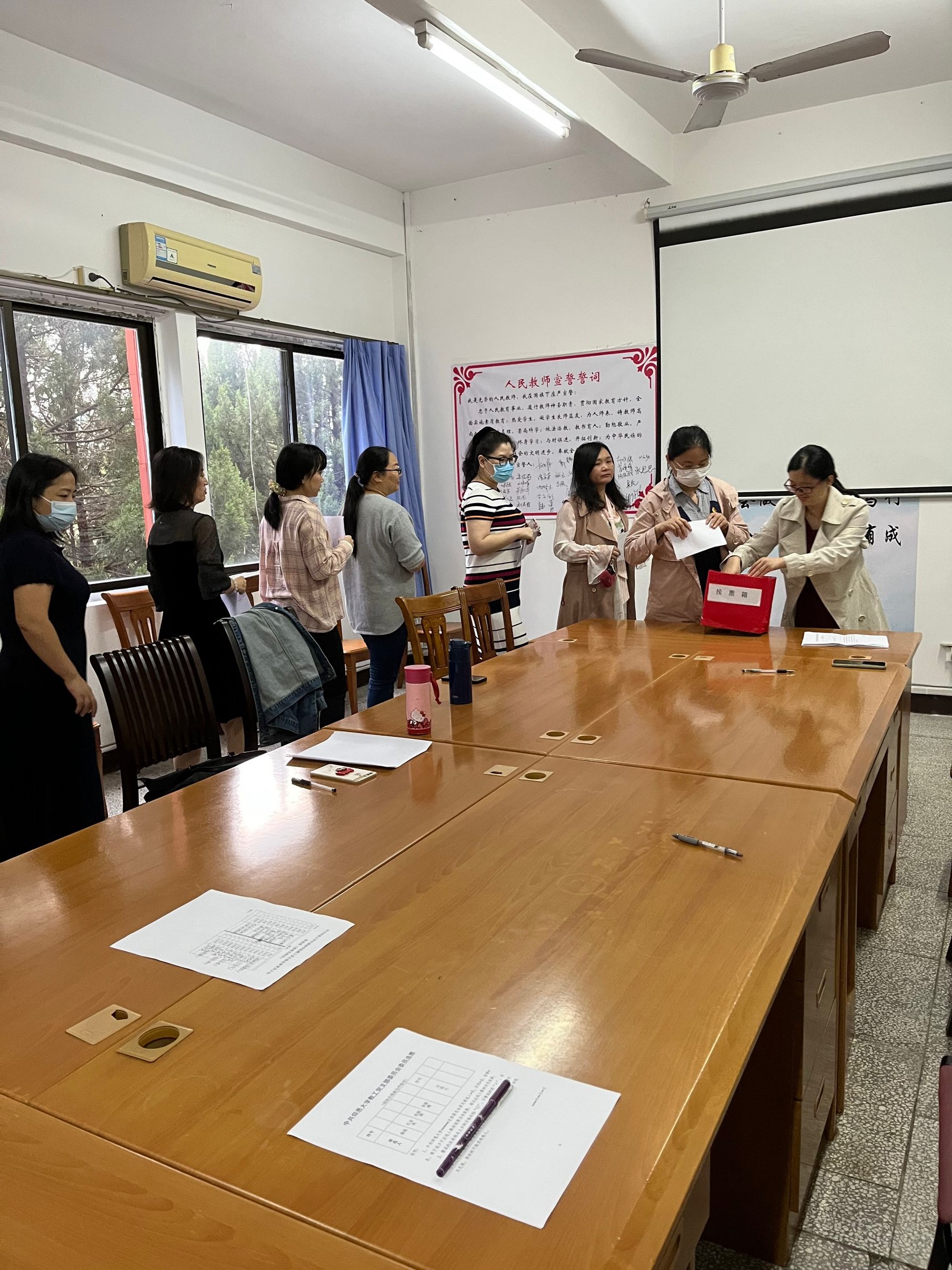 换届活动 本次换届选举大会依据《中国共产党章程》和《中国共产党基层组织选举工作暂行条例》等党内相关规定,严格按照流程进行。大会开始之前,全体党员佩戴好党徽,全体起立并庄严宣誓,重温了入党誓言。接着介绍大会的基本流程,签到点名后由李媛媛同志和庄金英同志分发选票,大家进行不记名投票。随后由计票人黄红卫同志和监票人郭锦云同志进行计票和宣读选举结果。