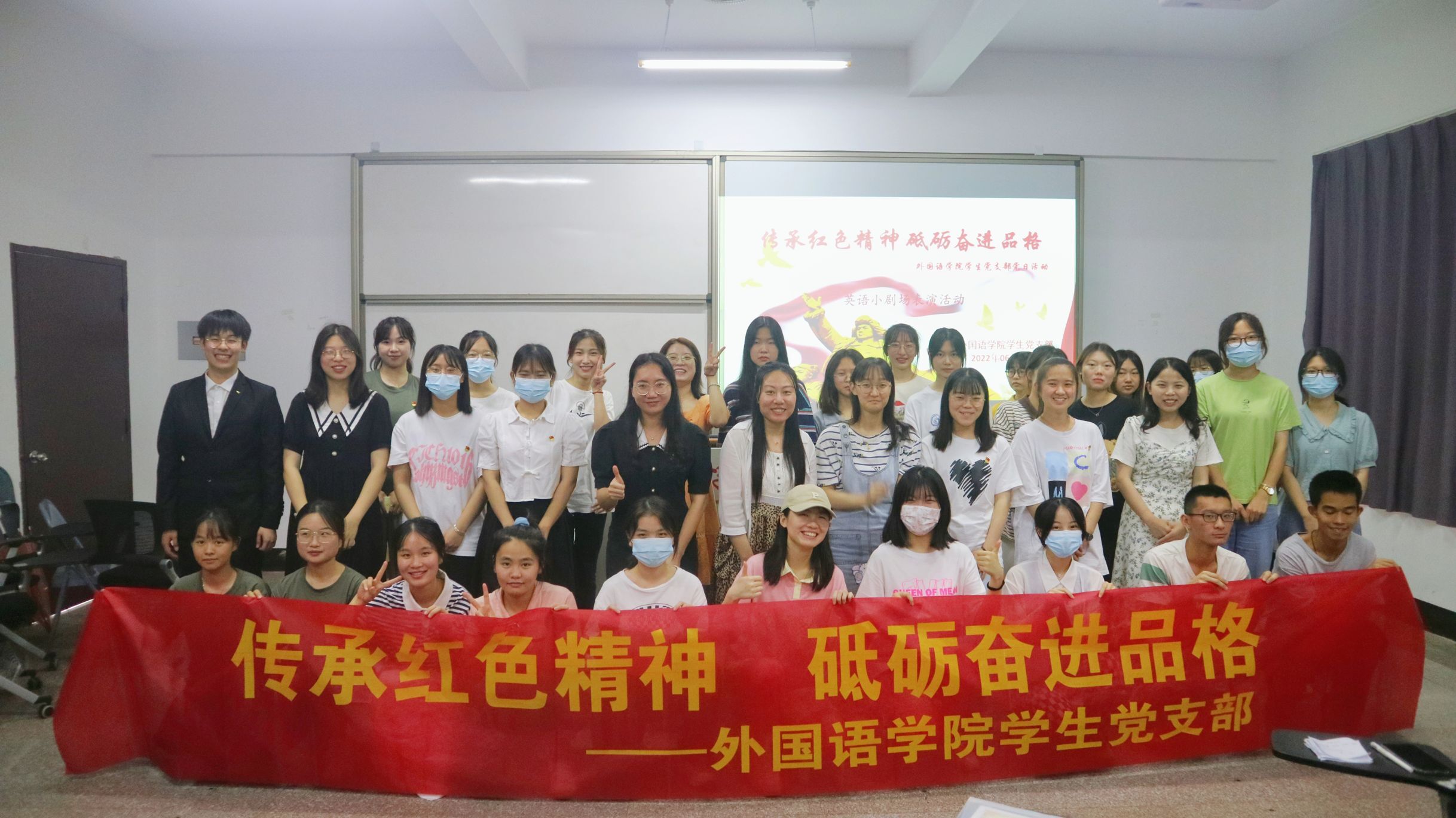 2022年6月15日下午beat365中文官方网站学生党支部在普照教学楼205教室开展 “传承红色精神,砥砺奋进品格”主题党日活动。本次主题党日活动包含两个主要部分:“传承红色文化,弘扬红色精神”主题英语小剧场表演活动和“红色盲盒,传承红色基因”活动。支部书记许淑琴老师,支部组织委员位美娅老师到场并作为评委老师,beat365中文官方网站全体在校学生党员进行活动表演,以及21级全体积极分子到场观看学习。