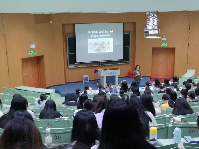 讲座(二)由菲律宾籍外教May Garcia主讲。May Garcia以跨文化意识为题,从文化含义出发,强调跨文化交际能力培养在全球化大背景下的重要作用,阐述其中存在的各种障碍及其产生的基本缘由,并就大学生如何培养跨文化交际意识提出了可行性建议。