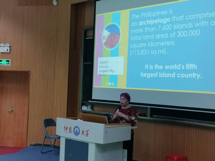 讲座(一)由菲律宾籍外教Lynette Garcia主讲。Lynette Garcia以旅游为中心,重点介绍了菲律宾的异国风情,并借鉴旅游实例,对中菲礼仪方面的跨文化差异作了深入浅出的交流。
