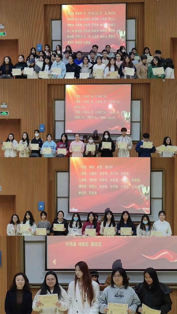 本次颁奖大会流程分为十二项,分别为暑期实践表彰、团日活动比赛表彰、爱我国防演讲比赛表彰、军歌合唱先进个人表彰、迎新先进个人表彰、阳光体育表彰、运动会方阵表演表彰、海丝志愿者表彰、三好学生表彰、优秀学生干部表彰、颁发2022-2023学年辅导员助理聘书以及英语实践课堂项目优秀实习生。