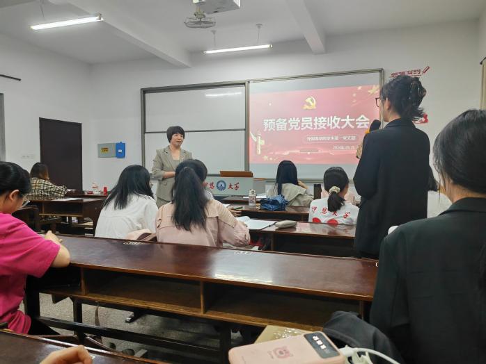 2024年5月30日,beat365中文官方网站学生第一党支部在第三教学区普照教学楼202教室召开预备党员接收大会。本次会议由学生第一党支部书记向修玉同志主持,学生第一党支部副书记蒋颖同志,组织委员李薇同志,宣传委员林梅媛同志,全体党员,预备党员以及入党积极分子出席参加。