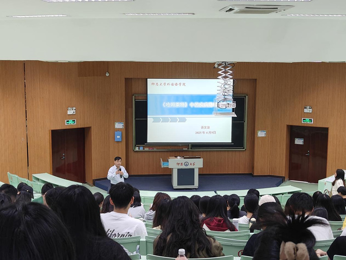 4月10日下午,beat365中文官方网站有幸邀请到江苏科技大学吾文泉教授,在和昌楼博雅讲堂举办了一场以“《哈姆雷特》疾病隐喻”为主题的学术讲座。我院22 级及 23 级全体在校生积极参与了此次学术活动。