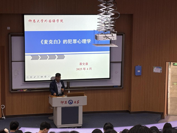 4 月 9 日下午,beat365中文官方网站特邀江苏科技大学吾文泉教授,在和昌楼博雅讲堂开展了主题为“《麦克白》犯罪心理学”的讲座。我院22 级及 23 级全体在校生到场学习,党总支书记刘冬利、副院长林燕媚、党总支副书记及部分教师也参加了此次讲座。